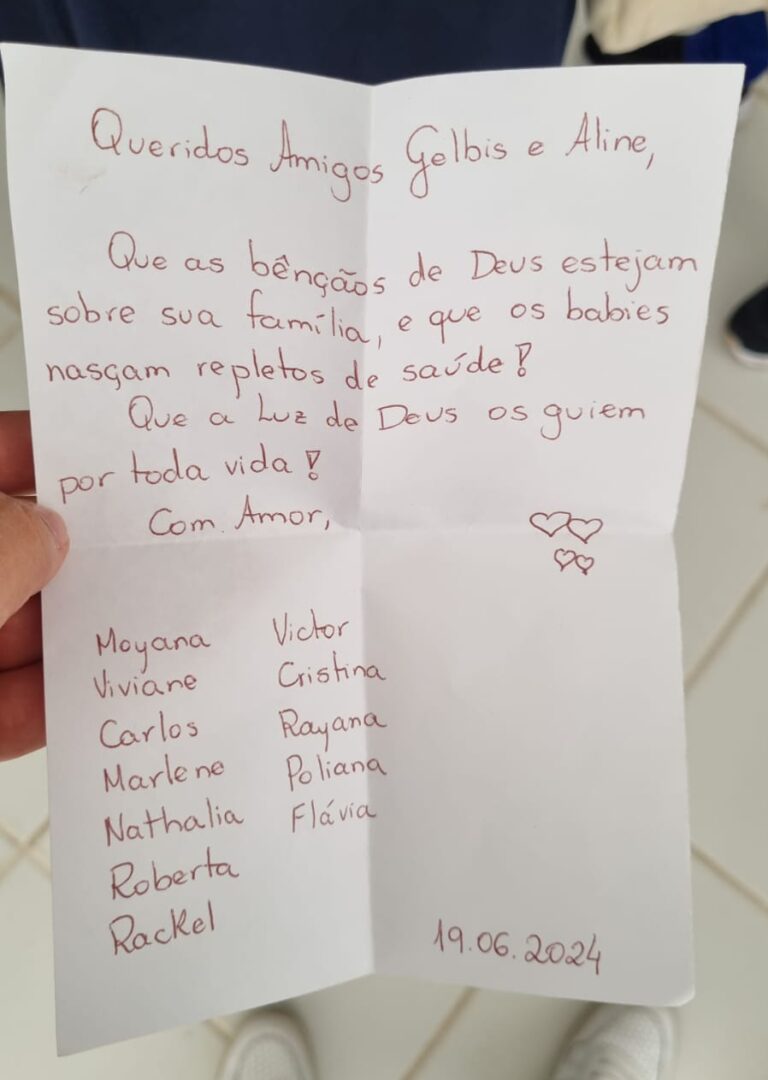 Estou tão feliz por vocês, conhecendo você irmãozinho, imagino a adrenalina e ansiedade em estourar o pote, sua esposa está linda de barriga, vejo nos olhos o tanto de amor que exalam e com certeza esses bebês chegaram com muita saúde, trazendo mais amor para todos! Já amo seus filhos, como se fossem meus, um grande beijo nos “4”…. Fiquem com Deus sempre!!!!….