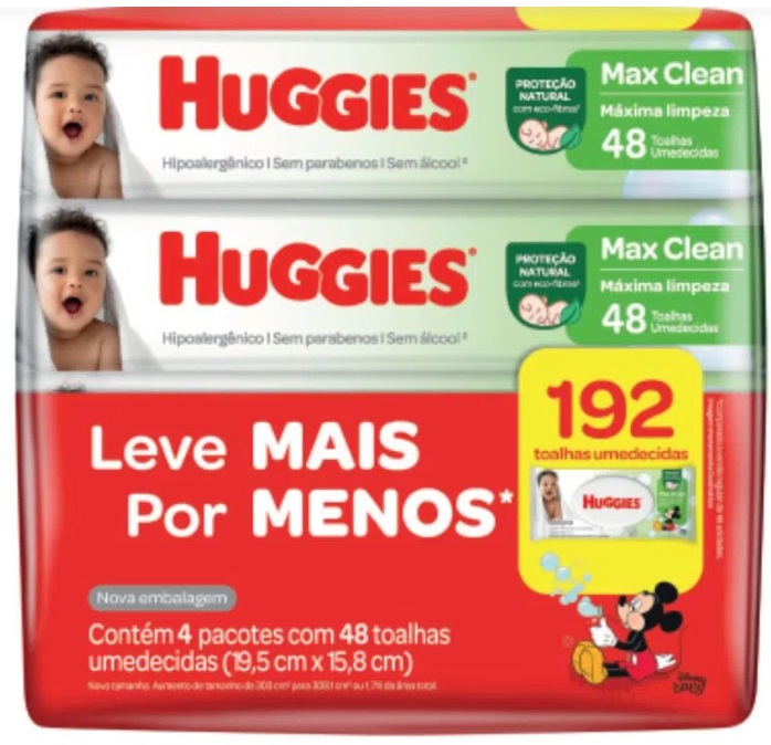 Lenços Umedecidos Huggies Max Clean Leve Mais Por Menos Com 192 Unidades. Máxima limpeza desde a 1ª passada. As Toalhas Umedecidas Huggies Max Clean foram elaboradas com ingredientes suaves e delicados, para garantir uma limpeza segura e efetiva da pele do seu bebê. Além de ajudar a prevenir assaduras e oferecer praticidade ao seu dia a dia.
